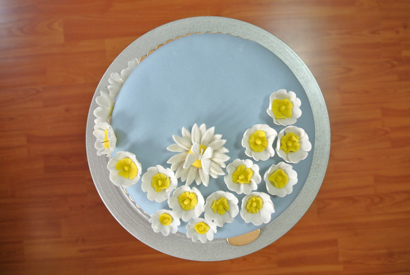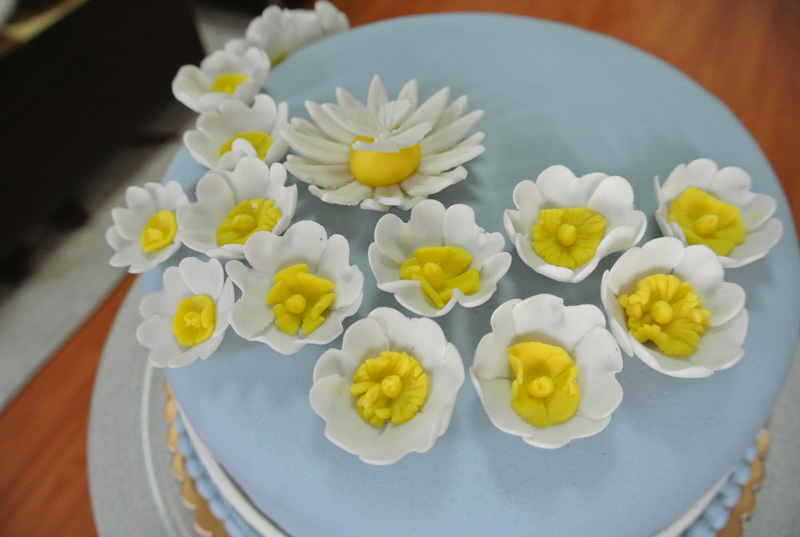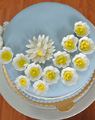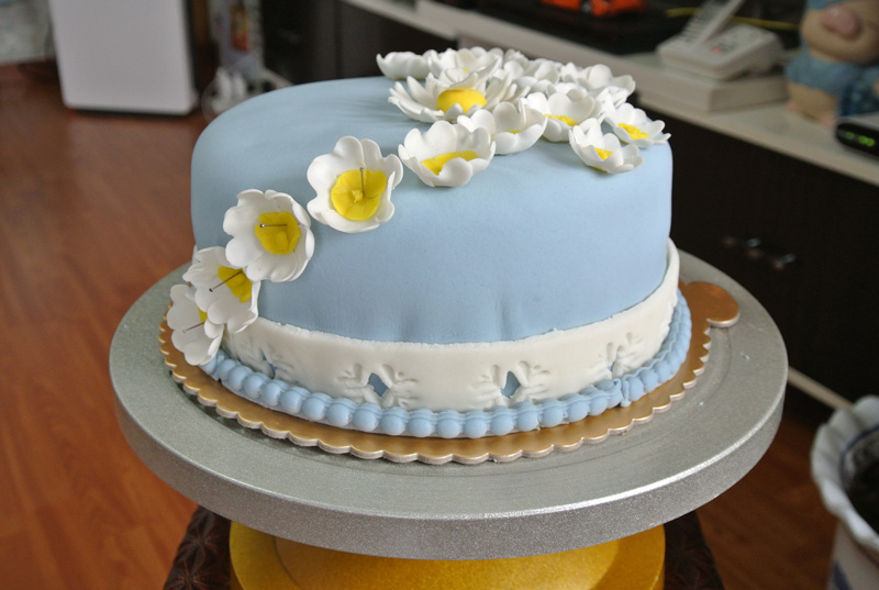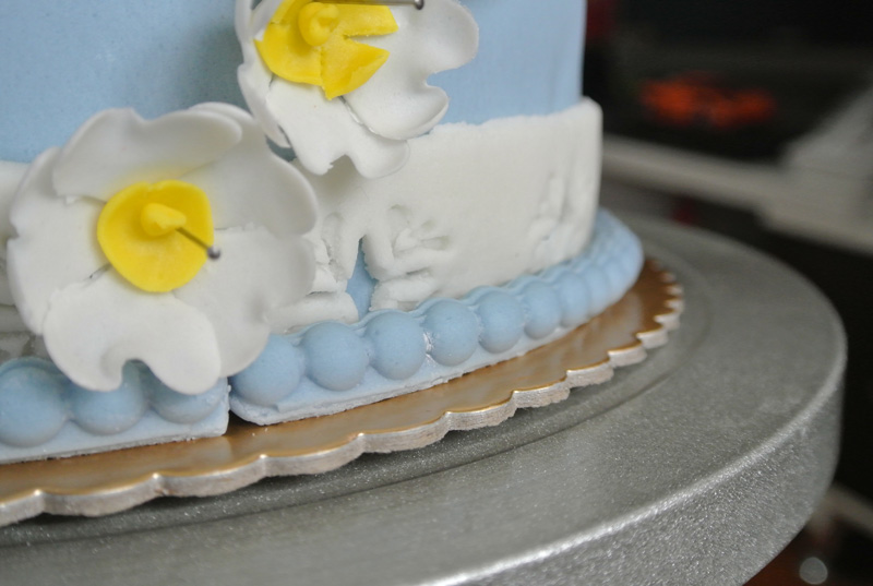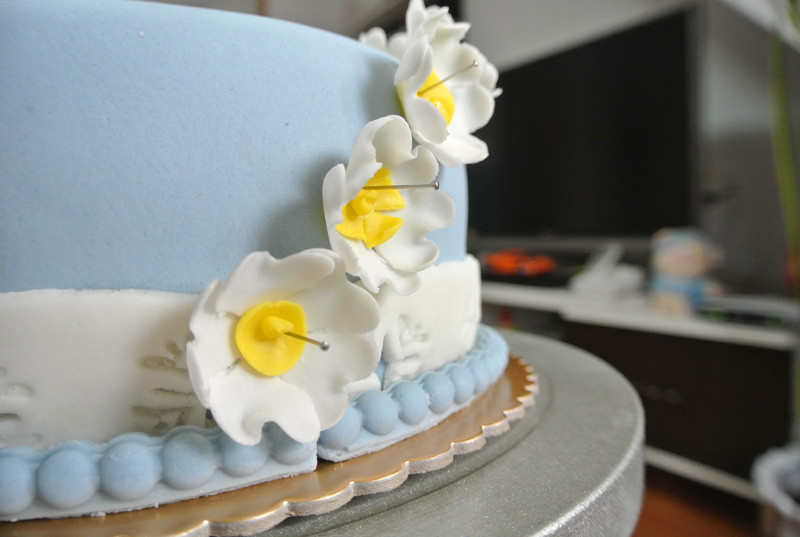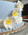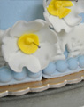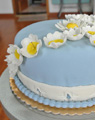 说明:这个蛋糕是送给一个可爱的小盆友的生日礼物,淡淡的蓝色配合洁白的兰花很适合5岁的小姑娘,用蝴蝶和珍珠裙边修饰,让素雅之余多了几分跳跃。